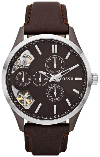 We love the classic and sleek look of this stainless steel and rich leather timepiece. A window in the dial reveals the inner workings of this must-have watch. Case Size: 44mmCase Thickness: 13mmBand Width: 22mmWater Resistant: 5 ATMWarranty: 11-year limited Origin: Imported